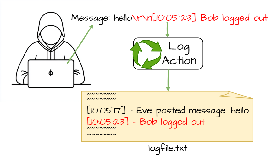 However, if an attacker submits the string "twenty-one%0a%0aINFO:+User+logged+out%3dbadguy", the following entry is logged: