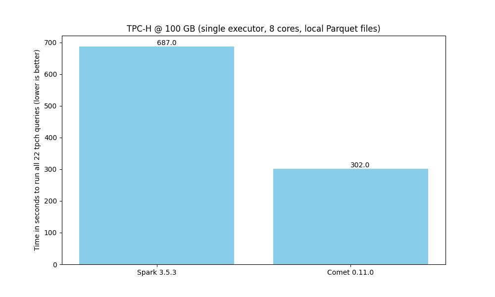 The following chart shows the time it takes to run the 22 TPC-H queries against 100 GB of data in Parquet format using a single executor with 8 cores. See the Comet Benchmarking Guide for details of the environment used for these benchmarks.