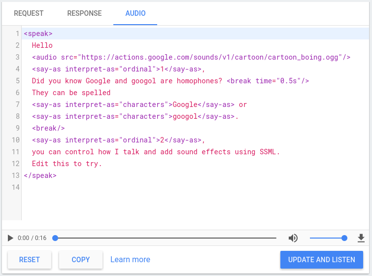 The Actions console includes a TTS simulator that you can use to test SSML with any of the above elements. You can find the TTS simulator in the console under Simulator > Audio. Type your text and SSML in the simulator and click Update and Listen to hear the TTS output.