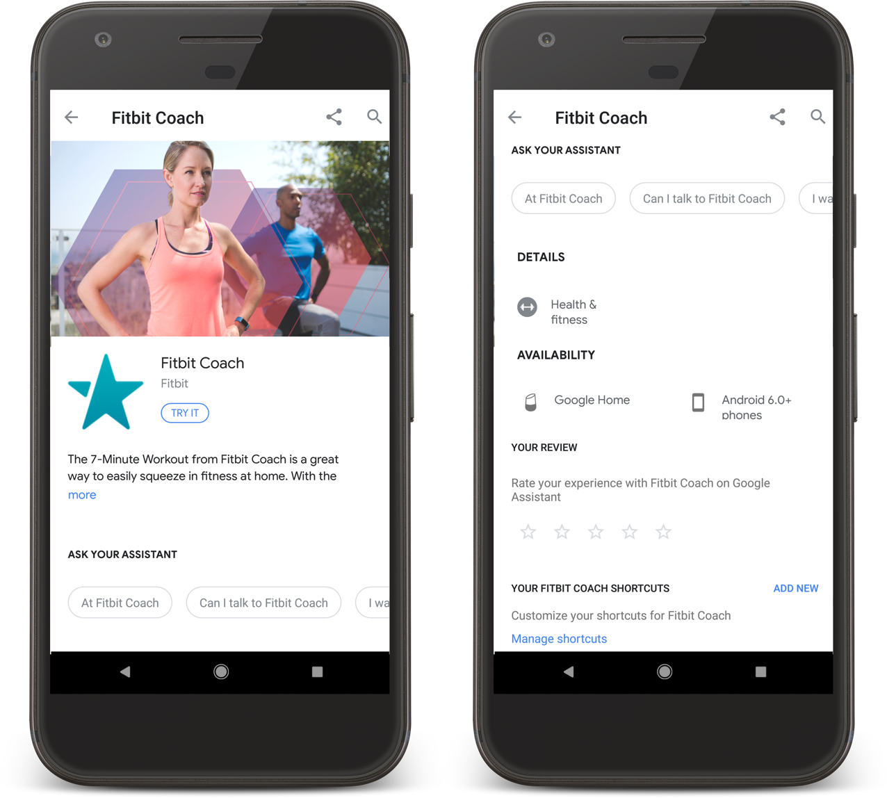 The following examples show a page for Fitbit Coach, a health & fitness Action that walks users through a home workout: