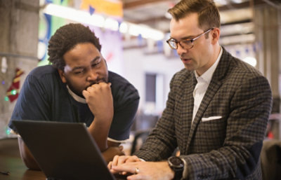 A woman smiling and pointing at a laptop screen while talking to a man, both seated at a table in an office setting.